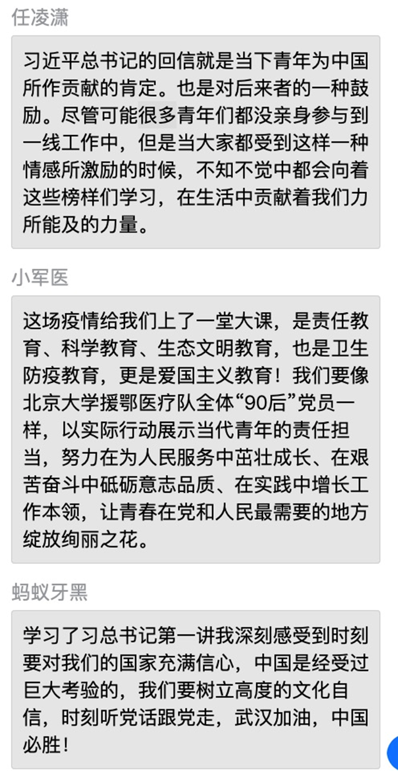在抗击疫情这场看不见硝烟的战争中,以“90后”为代表的青年一代挺身而出、担当奉献。习近平总书记为北京大学三家附属医院援鄂医疗队34名“90后”党员的抗疫“信心”进行了回信,“青年一代有理想、有本领、有担当,国家就有前途,民族就有希望。”支部成员对此也展开了讨论。