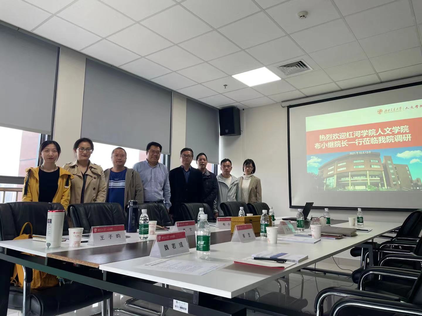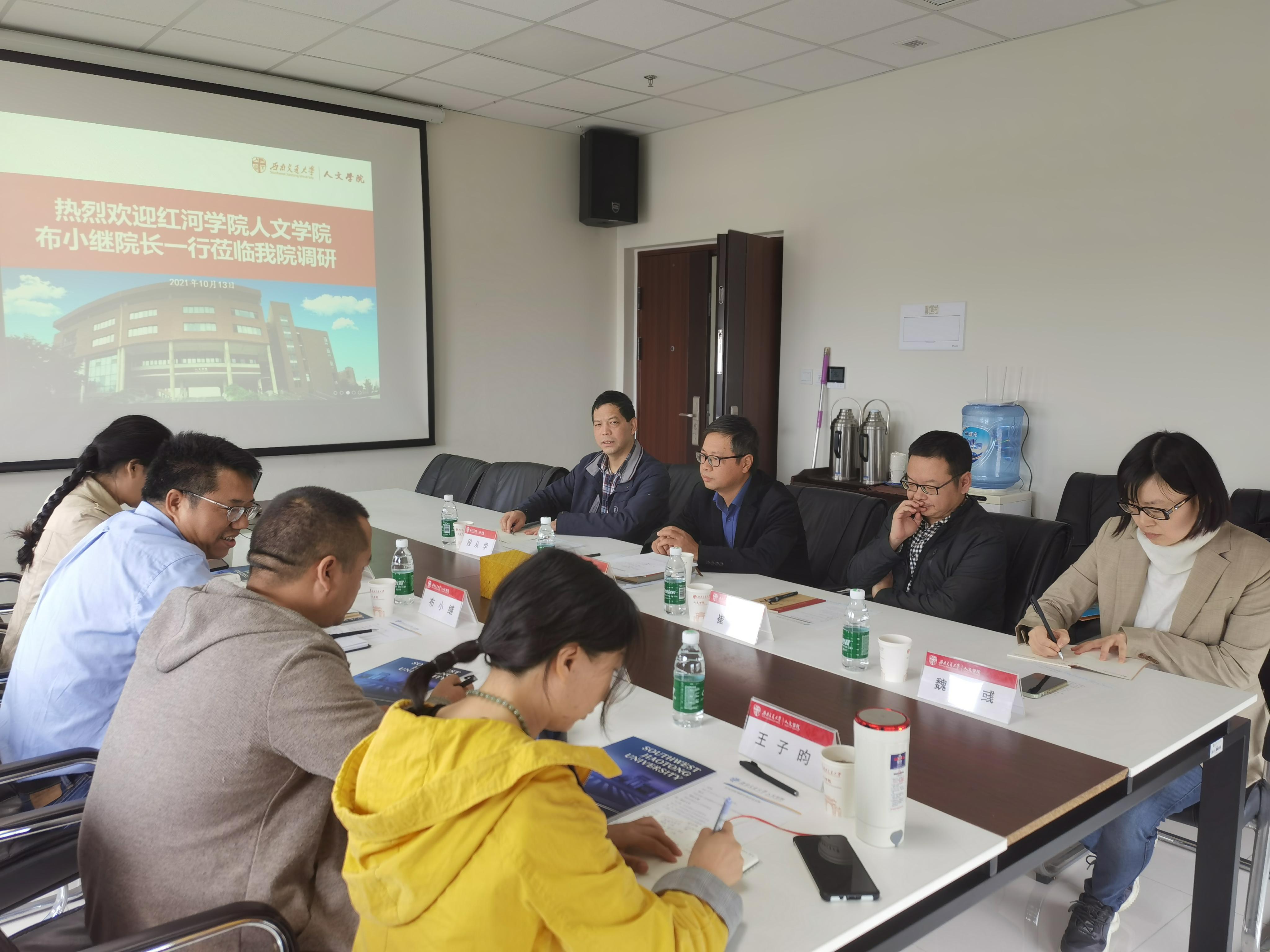 2021年10月13日下午2:30,红河学院365英国上市网站官网布小继院长一行四人到我院调研交流。学院沈如泉副院长、中文学科带头人段从学、哲学所所长崔罡、学科秘书魏若彧参加调研会。