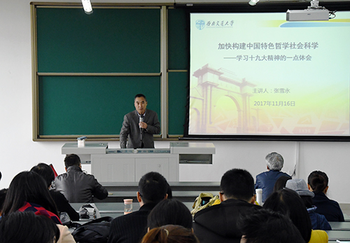 首先是全院教职工关于十九大专题的政治学习。学院邀请到了学校学习贯彻党的十九大精神宣讲团成员——文科建设处处长张雪永教授,作了题为“加快构建中国特色哲学社会科学——学习十九大精神的心得体会”的报告。他提出,党的十九大做出了中国特色社会主义进入新时代的重大判断,回答了构建什么样的哲学社会科学的问题;而新时代社会主要矛盾的重大转变,则回答了如何认识当前哲学社会科学的现状和不足的问题。当前的时代是一个需要理论也可以产生理论,需要思想也可以产生思想的时代,高校要加快完善对哲学社会科学具有支撑作用的学科建设,构建具有自身特质的学术评价体系。张处长还与全体教职工分享了自己关于十九大报告中一些新提法、新思想的心得体会,在场教职工受益匪浅。