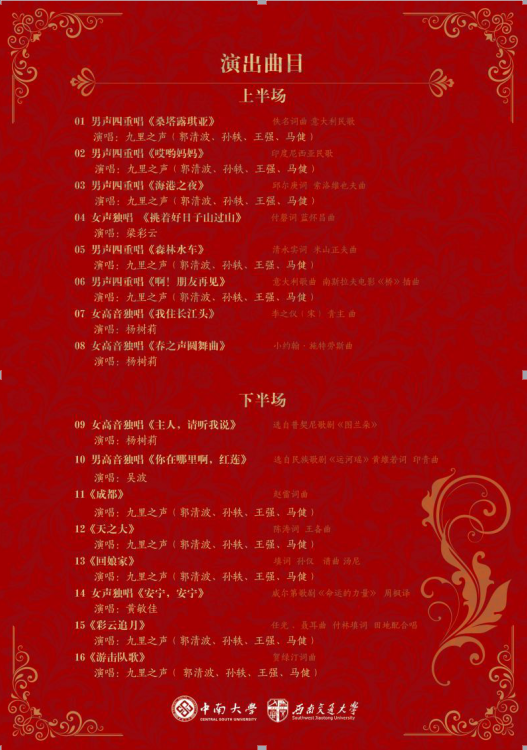 5月27日晚7点半,高雅艺术进校园/雅韵中南--西南交大音乐系走进中南大学专场音乐会在长沙·中南大学建筑与艺术学院音乐厅隆重登场。我校365英国上市网站官网音乐系杨树莉教授和九里之声四重唱组合:郭清波、孙轶、王强、马健老师为中南大学的师生们带来了《我住长江头》、《主人,请听我说》、《桑塔露琪亚》、《海港之夜》、《森林水车》、《成都》、《回娘家》、《游击队歌》等中外经典曲目。演出受到了中南大学师生热烈欢迎,现场掌声如潮,气氛热烈,观众打着拍子为老师们的演唱鼓掌喝彩。本次演出促进青年学子的音乐审美能力和艺术素养,也是西南交大365英国上市网站官网音乐系的教学特色的一次展示,更是一次加强合作、携手共进的完美契机。演出结束后,中南大学建筑与艺术学院院长赵小平教授对此次演出给予了高度评价。他说:“感谢西南交大音乐系的老师们为我们带来了一场高水平的音乐会,不但推动了两校的高水平的专业交流,增进了了解和友谊,也是我们学习的榜样,今后我们也要像你们一样,走出去,让老师们加强舞台表演经验,更好的引导学生学好本专业,为他们作榜样,今后希望两校音乐专业之间加强合作交流,实现共赢!”